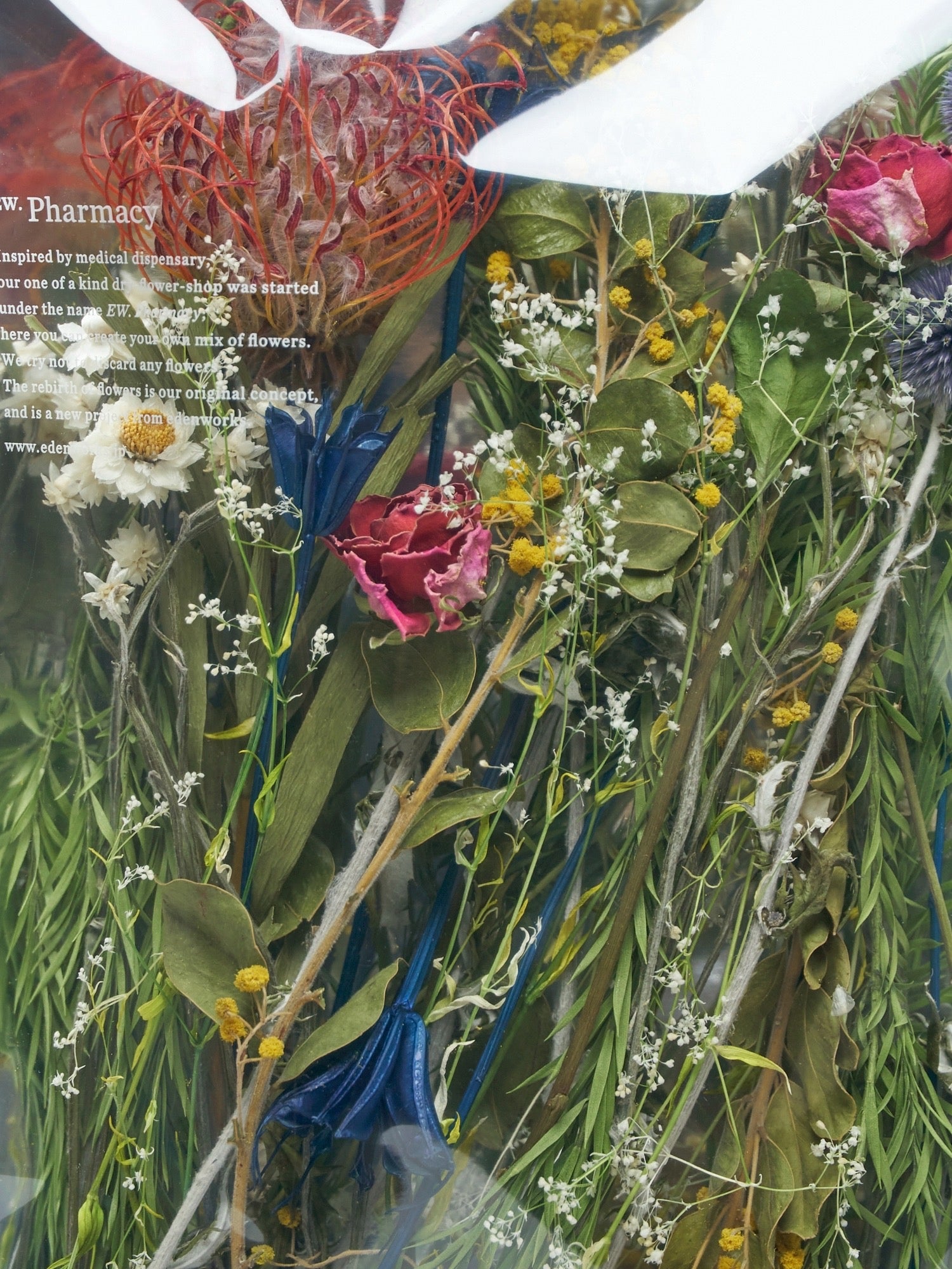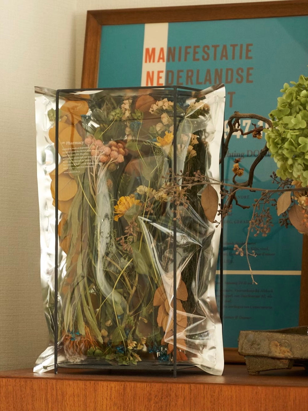 We carefully pack 8 kinds of seasonal flowers in an original package. You can arrange the flowers in a vase, or leave the package as is and hang it on a wall or shelf.