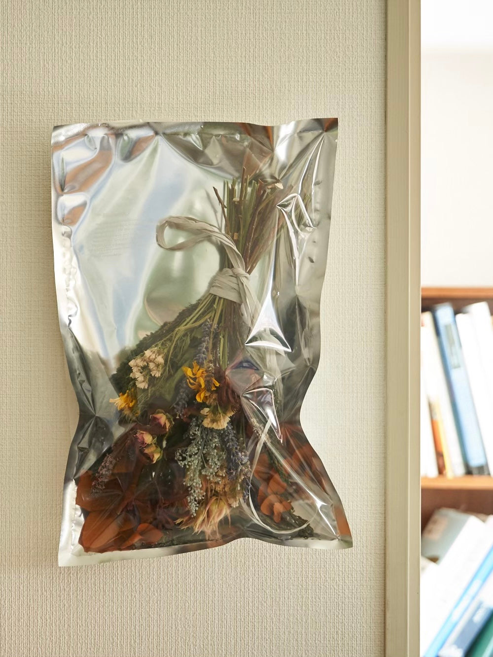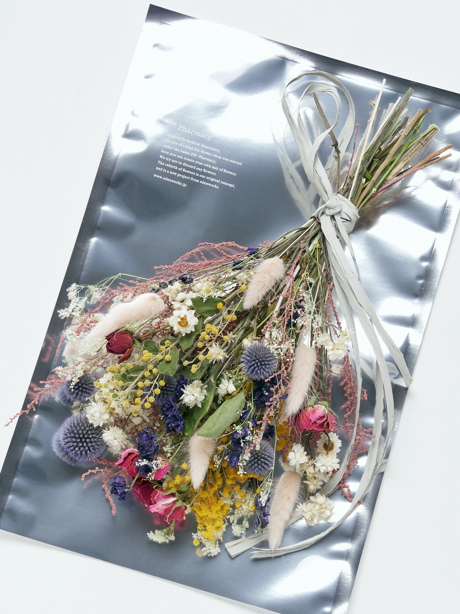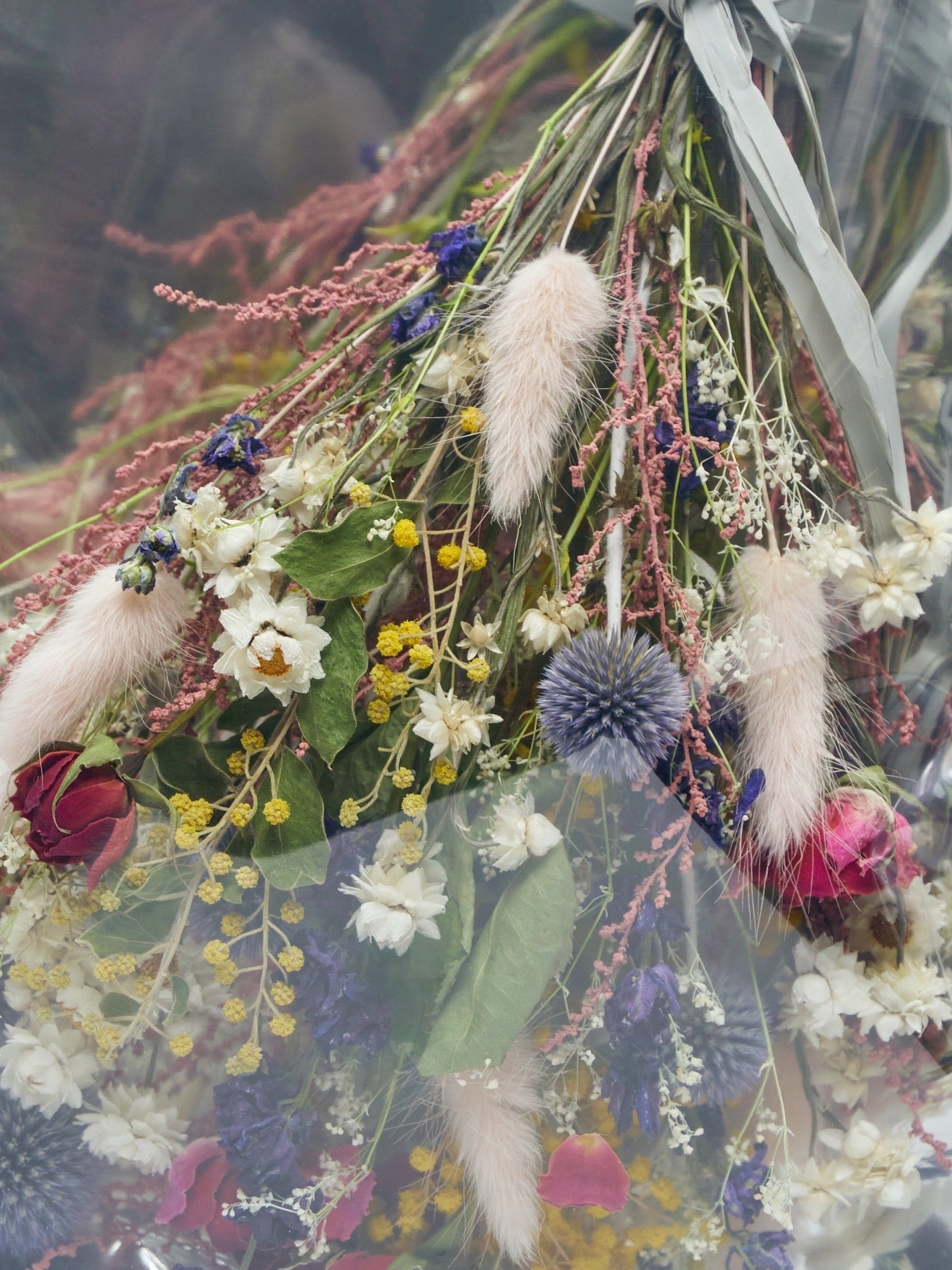 This is the swag version, with a wire loop attached to the back of the bunch of flowers, making it easy to display on a wall or in a hallway.