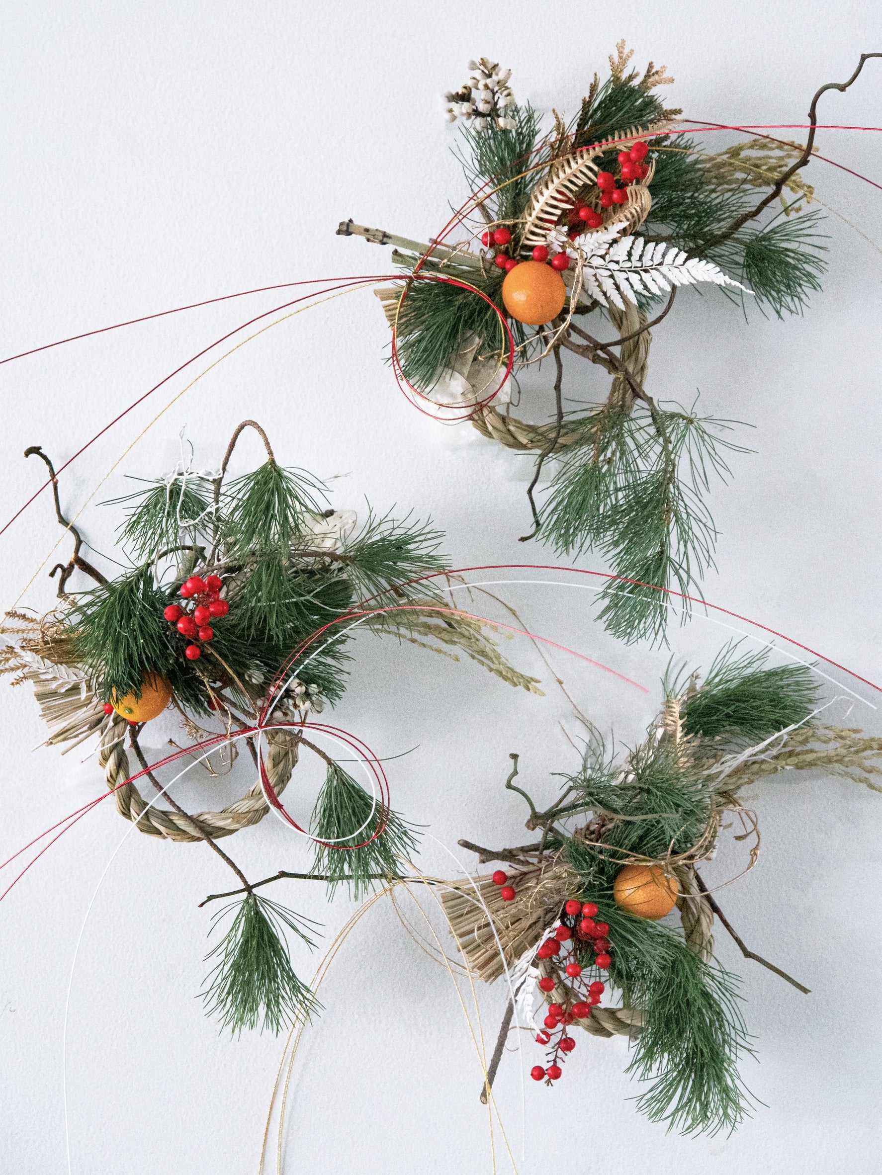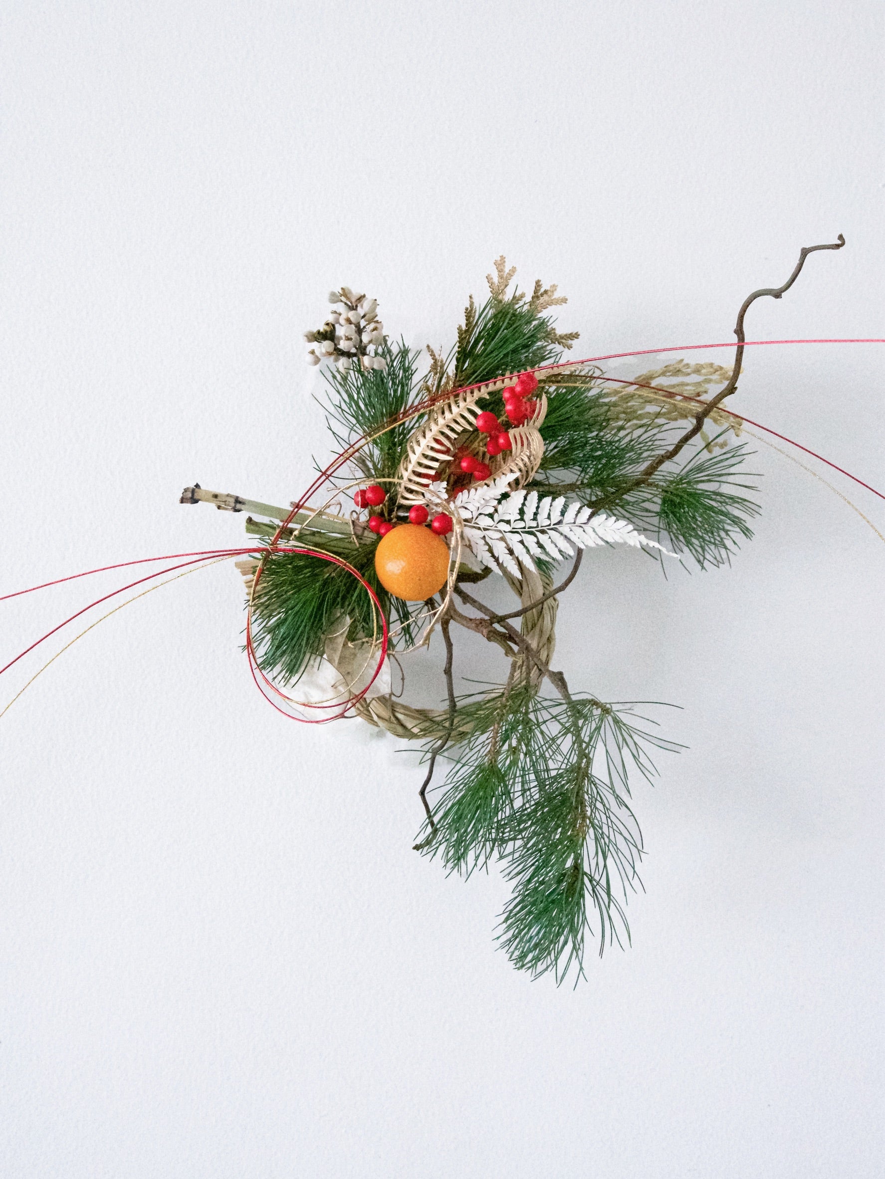 フレッシュな松や南天などに加えて、ゴールドやシルバーにペイントしたドライフラワーなどもお付けして華やかに仕上げました。